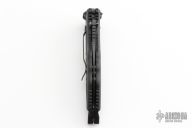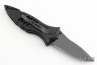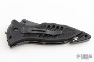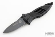 This CQD Mark 1 Auto from Masters of Defense has a spear point black blade with dual thumb studs. Handle is black aluminum with non-slip inserts, reversible black tip down clip, seat belt cutter, lanyard hole and glass breaker. Comes with velcro belt sheath. Has some light scuffs, otherwise excellent condition.