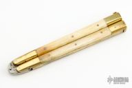 This knife by Gutmann Cutlery is marked "Original Balisong" with brass fittings and semi-flat polished bone scales. Hand made in Philippines. Part number 11-524 on blade. Comes with original nylon sheath and box. Has some light scratches and patina, otherwise excellent condition.