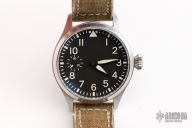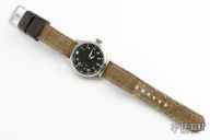 Wilson Watch Works Big Pilot with 45mm hand brushed German Made case with double AR coated swiss made flat sapphire crystal. Dial and hands with C3 Superluminova. Diamond crown. Sappire caseback. Swiss made Soigne ETA handwind 18.000 a/h, incablock shock protection movement. Finely decorated with flame blue screws, wide Geneva stripes decoration with polished edges, perlage on the baseplate and pallet bridge, polished gearset with polished and sun bursted winding wheels. Has a couple light scratches and small dings, otherwise excellent condition. Comes with fit with a custom Greg Stevens Design 1960s Czech Military Canvas band with brown leather backing and stainless steel buckle. Comes with a leather pouch.