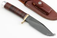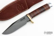 This Sergeant's Special by Randall Made Knife features a gun blued blade with sharpened top edge and a notched thumbrest, .203" blade stock and 1.377" blade depth, hidden tang construction. The handle has a brass guard and duralumin butt with stacked leather grip. Comes with a brown leather sheath. Has come light scuffs, otherwise excellent condition.