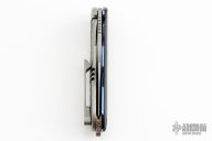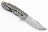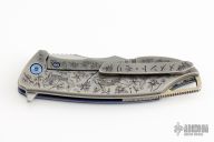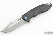 This S7 flipper by Michael Zieba features a two-tone blade with a notched thumbrest and a flipper. The handle has a marble carbon fiber and laser engraved titanium frame, textured silver backspacer and a laser engraved titanium tip up clip with hidden screws. Nice detent, lockup and blade seating. Rides on bearings. Comes with zippered case. Excellent condition.
