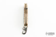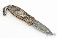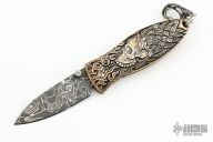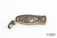 The Morpheus is the world’s first luxury pendant knife, created to be worn on the neck or carried in the pocket. The 'Departure' is a bold bronze pendant finely cast with timeless skull symbols, featuring a hidden, state-of-the-art blade made from 'Intrepid' damascus steel, hand-forged by master forger Chad Nichols from hundreds of layers of different steel alloys and folded into unique tapestries reminiscent of waves and flowing water. A spinel gemstone conceals William Henry’s button lock ensuring that the blade is securely locked both open and closed, for safe wear and carry. The 'Departure' comes on a PVD black-coated bronze chain with a sterling clasp. A sterling silver quick release clasp allows you to take the knife off the chain for use, or to attach the knife to a keychain. Comes with original box, and papers. Excellent condition.