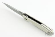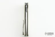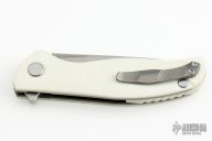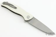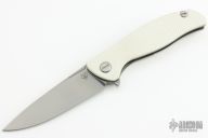 This F3 Flipper from Shirogorov Knives has a tumble finished flat ground drop point blade with notched flipper. Handle has white G-10 scales and backspacer, tumbled titanium tip up clip and liners. Recessed lanyard bail. Dead center blade seating, excellent detent and lockup. Original box and COA. Excellent condition. Bearing System. Excellent condition.