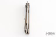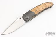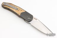 This linerlock flipper from Andre Thorburn and Andre Van Heerden features a hand rubbed satin finish blade with a false top edge, notched thumbrest and front flipper. The handle has carbon fiber scales with box elder burl inserts, carbon fiber backspacer, anodized titanium liners, and a titanium clip, tip up carry. Features DUAL ROW IKBS. Excellent fit and finish. Smooth action. Includes a nylon velcro case. Excellent condition.