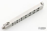 The model 45 by Benchmade features a spear point blade with false top edge. Stainless steel skeletonized handles with T latch. Blade spine has file work by Matt Cook. Comes with nylon belt sheath. Has some light scuffs and scratches, great condition otherwise.