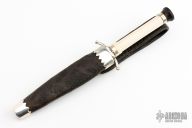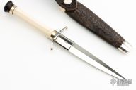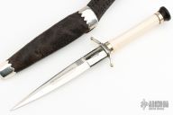 This is a Vintage Dagger by UK&R Co Germany. It features a mirror polished blade with unsharpened edges, .236" blade stock and .704" blade depth, hidden tang construction. The handle has a silver guard with gold balls on the quillions, octagonal antique ivory grip with gold spacers, ebony wood butt and a piece of red coral set in a gold bezel on a silver plate. Comes with original elephant leather scabbard with silver fittings. The back of the blade is marked "KRAUS 1". The front of the blade is etched "PAL BRAND". Has a few light scratches, otherwise excellent condition.