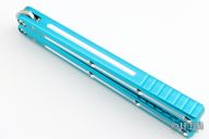 This Inked Krake Raken V2.5 model (formerly known as the Kraken), has a teal finished 7075 aluminum alloy handle and a modified tanto blade with a long swedge. The blade has satin finish.