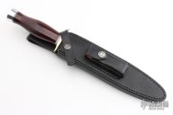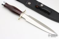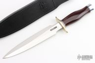 The Model 2-8 by Randall Made Knives is a heavily made dagger or dirk. Nickel silver guard, maroon linen micarta grip, duralumin butt cap, black/duralumin spacers. Double-edged satin finished blade, .206" blade stock and 1.363" blade depth, hidden tang construction. Comes with a black leather sheath and a Randall zippered case. Excellent condition.
