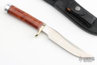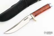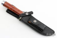 This Model 3-6 by Randall Made Knives features a satin finished blade with false top edge and notched thumbrest, .207" blade stock and 1.127" blade depth, hidden tang construction. The handle has a nickel silver guard, Amboyna Burl wood grip with red/white/blue spacers, duralumin butt. Comes with a black leather sheath and and a Randall zippered case. Excellent condition.