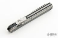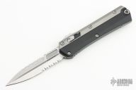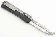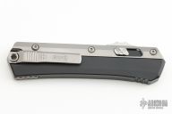 This Glykon by Microtech features a stonewashed double edged blade with fullers and notched thumbrest. The handle has a black aluminum chassis with bead blasted titanium overlays and tip down clip. Comes with original box and papers. Excellent condition. Dated 03/2023 and #573