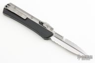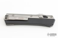 This Glykon by Microtech features a stonewashed double edged blade with fullers and notched thumbrest. The handle has a black aluminum chassis with bead blasted titanium overlays and tip down clip. Comes with original box and papers. Excellent condition. Dated 03/2023 and #508