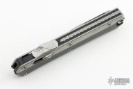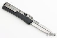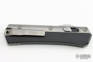 This Glykon by Microtech features a stonewashed double edged blade with fullers and notched thumbrest. The handle has a black aluminum chassis with bead blasted titanium overlays and tip down clip. Comes with original box and papers. Excellent condition. Dated 03/2023 and #537