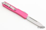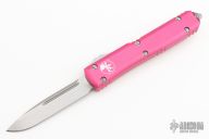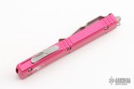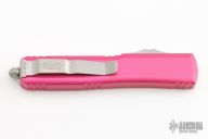 This Ultratech OTF automatic features a stonewash finished drop point blade with fullers and single blade edge. Handle is contoured pink aluminum, marked 05/2022 with serial number 243761. Stainless steel hardware, and clip. Comes with original box and papers. Excellent condition.