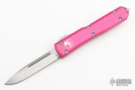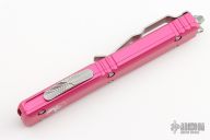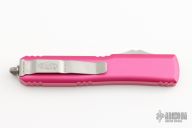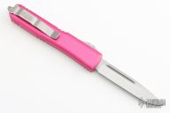 This Ultratech OTF automatic features a stonewash finished drop point blade with fullers and single blade edge. Handle is contoured pink aluminum, marked 05/2022 with serial number 243835. Stainless steel hardware, and clip. Comes with original box and papers. Excellent condition.