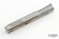 The smaller EXO-M has all the benefits of the full-size EXO from Reate Knives, but has even more to offer! For one, the smaller size makes this an even more convenient pocket knife. Plus, with a secure titanium pocket clip and lock, Reate ups their game with this gravity OTF Knife. A safety slide lock on the face of the handle is ideal for user safety, and the new pocket clip makes EDC carrying as easy as can be. By pinching the milled handle scales and dropping the frame at an angle, you can easily slide the blade in and out with nothing but gravity. If you haven't guessed it already, this means hours of quality fidgeting! That aside, the build and materials of this knife are Reate standard: simply excellent and endlessly functional. Like the EXO, the EXO-M boasts flawless fit and finish, smooth action, and a razor edge to meet your cutting needs. It includes a leather slip for safe carrying as well as the titanium clip.
