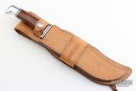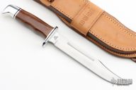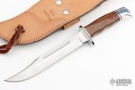 This Model 120 Custom Bowie by Buck Knives features a satin finished clip point blade with false top edge and fullers, .175" blade stock and 1.087" blade depth, hidden tang construction. The handle has an aluminum guard and butt, and a natural canvas micarta grip. Comes with original brown leather sheath. Excellent condition.