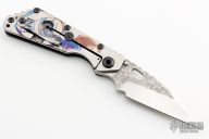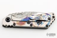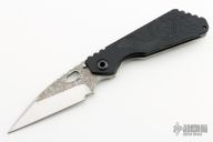 This Mick Strider SNG framelock folder features a two-tone pike ground blade with thumbhole and notched thumbrest, magma finished flats. The handle has a black aluminum and laser engraved titanium frame with titanium clip, tip up carry. Jimping on blade spine. Nice lockup, detent, and blade seating. Excellent condition.