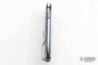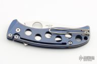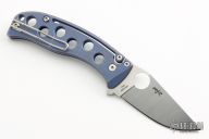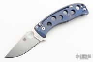 The PITS (Pie in the Sky) Folder is based on Mike Read's popular non-locking folder, which has been designed to comply with British knife laws. It has a full-flat ground N690Co steel clip point blade and precision-machined blue skeletonized titanium handle that aids in providing texture for grip. In addition, the handle features integral split spring arms to form the knife's unique slip-joint mechanism. Mike Read designed this knife to be a tough, hard-use folder and the combination of the lower blade guard with the integral spring act to prevent unintended closure. The PITS Folder includes Spyderco's deep carry wire clip for reversible tip-up carry. Has some scuffs/scratches, otherwise good condition.