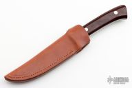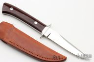This Model 11 by George Herron features a mirror polished blade with a false top edge, .188" blade thickness and .798" blade depth, full tapered tang construction. The handle has a stainless steel guard and micarta scales. Comes with original leather sheath. #819. Excellent condition.