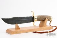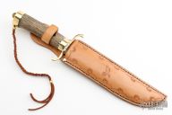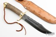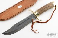 This Bowie by DV Customs features a Damascus blade with false top edge, fullers and fileworked spine, .187" blade stock and 1.760" blade depth, hidden tang construction. The handle has brass guard and butt, stag grip, lanyard hole. Comes with a red oak stand and a brown leather hand tooled sheath. New from maker. Comes with a COA #199