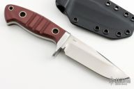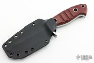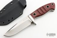 This Mini Scout Hunter by Shane Sibert features a satin finish with notched thumbrest, .250" blade thickness and 1.330" blade depth, full tang construction. The handle has a stainless steel guard and red linen micarta scales with black G-10 liners. Comes with a kydex sheath. Has a few light scratches, otherwise excellent condition.