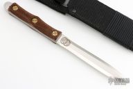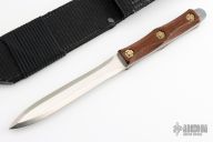 This Dagger by EK Knives has a satin finished double edged wasp waist blade with .146" blade stock and .960" blade depth, full tang construction. The handle has checkered wood scales. Includes black nylon sheath and original box. Excellent condition. Dated 2/2006