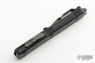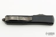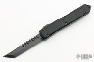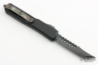 This Ultratech Hellhound by Microtech Knives features a black stonewash DLC blade with notched thumbrest and fullers, false top edge. The handle has a black aluminum frame with tip down black stainless steel clip, black DLC hardware, black titanium thumbslide. Comes with original box and papers. Excellent condition. Dated 09/2021 and s/n 400