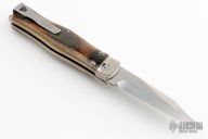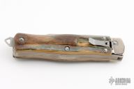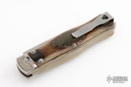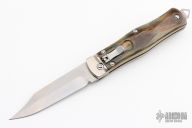 This Cobra Bowie Lever Lock Auto #00403 10/2011 has a stonewashed bowie blade. Handle has titanium boslters, custom mammoth ivory scales, titanium liners, titanium backspacer with a stainless steel tip up clip and lanyard loop. Excellent condition. Comes with original box, papers and nylon sheath.