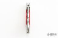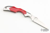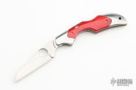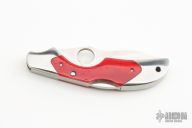 This Kiwi lockback folder by Spyderco has a satin finished wharncliffe blade with a thumbhole. The handle has stainless steel bolsters and liners and red bone scales that have been pinned. Comes with original box, excellent condition. Discontinued