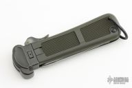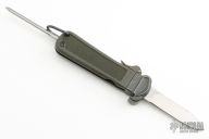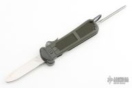 This Gravity knife is sterile, it features a satin finished blade. Blade deploys with gravity. The handle is black/green plastic with folding marlin spike. Excellent condition.