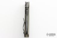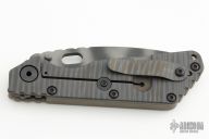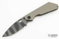 This SMF framelock folder by Mick Strider features a tiger striped drop point blade and a dimple pattern bronze aluminum and flamed titanium frame and tip up titanium clip. Includes a "Lock Bar Stabilizer" for maximum reverse lock retention. Nice detent, lockup and blade seating. New condition.