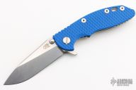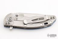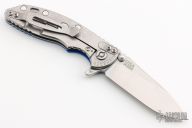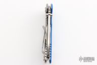 This 3" Slicer XM-18 flipper from Hinderer Knives has a stonewashed blade with notched thumbrest and flipper, no choil. Blue G-10 scale and a stonewashed titanium frame and clip. Reversible pocket clip. Strong lock up, nice detent and blade seating is center. Includes original box, extra bushings and papers. Excellent condition.