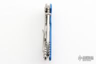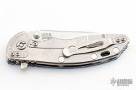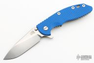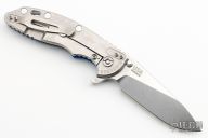 This XM-18 flipper from Rick Hinderer Knives features a 3.5" tumble blade, notched thumbrest and flipper, dual thumbstuds. The handle has a blue G-10 scale, and a blue anodized and stonewashed titanium handle/clip. Clip can be mounted for tip up or down carry. Nice lockup, seating, and detent.  Comes with original box, papers, and extra pivot washers. Excellent condition.