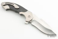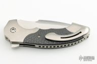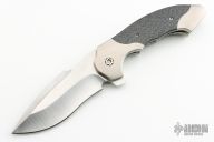 This gorgeous Archangel from Mr. Fischer features a satin finished spear point tanto blade with false top edge, notched thumbrest and flipper. The handle has double orange peel finished titanium bolsters, front and rear, silver lightning strike carbon fiber scales, titanium liners, backspacer, and a tip up titanium clip that has a matching orange peeled finish and hidden fasteners. Blade is centered when closed and locks up with no play. Nice crisp detent. Very smooth action thanks to Mr. Fischer's bearing system. Includes a padded zippered case.  Excellent Condition.