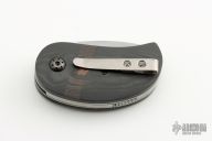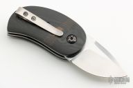 This Minnow scale release by Phil Booth features a satin finished drop point blade. The handle has fat carbon scales with a black/copper spacer and a steel backspacer.  Orange peel finished tip up titanium pocket clip. Nice lockup, action and blade seating. Comes with a zippered case.  Excellent Condition.