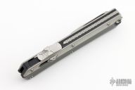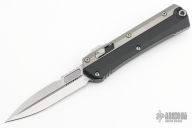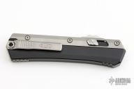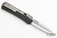 This Glykon by Microtech features a stonewashed double edged blade with fullers and notched thumbrest. The handle has a black aluminum chassis with bead blasted titanium overlays and tip down clip. Comes with original box and papers. Excellent condition. Dated 02/2023 and #418