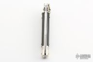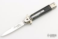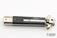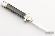 This Leverletto Lever Lock Auto has a mirror polished stainless steel spear point blade. Handle has buffalo horn scales, fluted nickel silver front and rear bolsters, stainless steel liners and back spacer, and nickel silver lock release button. Excellent condition.
