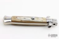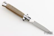 This 9" Picklock by Frank Beltrame features a mirror polished flat ground 4mm blade. The handle has mirror polished stainless steel bolsters, front and rear, honey horn scales, mirror polished brass liners and stainless steel spring. Excellent condition.