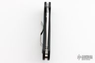 Handle: Peel ply textured, chamfered black G10 scales house inset skeletonized stainless liners, one forming the Compression Lock mechanism. A generous palm swell, index groove and pinky hook offer comfortable ergonomics and a secure grip for most users.