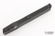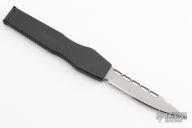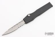 This HALO II is the clip point blade model in the HALO series by Microtech Knives. Single action, side positioned button for firing. Closure via a reverse charging handle in the rear of the frame. Contoured frame grip with milled ribbing on the frame spine and belly. This Halo II has a bead blasted clip point blade. Dated 03/98. Comes with a Microtech box and papers. Has some light scuffs, otherwise excellent condition.