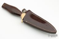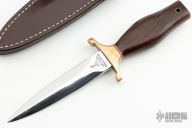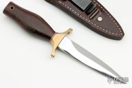 This Mark I Presentation Boot Dagger by Gerber features a mirror polished double edged blade, .250" blade stock and .959" blade depth, hidden tang construction. The handle has a brass guard, and cocobolo handle with red and white spacers. Comes with original brown leather sheath. #006236 blade. Has a few light scratches, otherwise excellent condition.