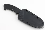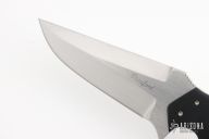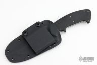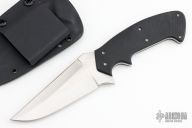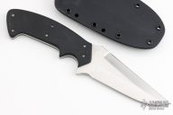 This Kasper fighter by Crawford Knives features a hand rub satin finished blade with notched thumbrest and sharpened top edge, .145" blade stock and 1.791" blade depth, full tapered tang construction. The handle has black linen micarta scales. Comes with kydex sheath. Has a few light scratches, otherwise excellent condition.