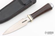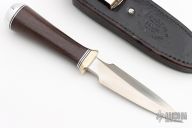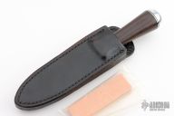 This Model 2-4 by Randall Made Knives features a satin finished double edged blade, .162" blade stock and .929" blade depth, hidden tang construction. The handle has reduced nickel silver hilt and duralumin butt, rosewood grip with black/duralumin spacers. Comes with black leather sheath and a Randall zippered case. Excellent coniditon.