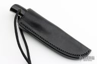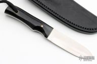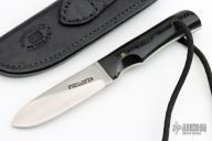 This Model 10 Salt Fisherman and Household Utility features a satin finished upswept blade with swedge and notched thumbrest, .112" blade stock and .832" blade depth. The handle has black linen micarta scales with brass pins over full tang construction. Brass lanyard tube with lanyard in pommel. Includes a black leather sheath and a Randall zippered case. Excellent condition.