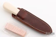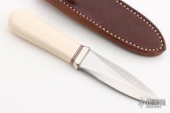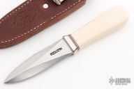 This Model 24 Guardian by Randall Made Knives features a satin finished double-edged blade with notched finger rests, .165" blade stock and .991" blade depth, hidden tang construction. Ivory Resin grip with red/white/blue spacers and a nickel silver guard. Both edges of the blade are sharpened with 1" of thumb notches. This model was designed in 1978 for use by police, undercover agents and law enforcement personnel for self-protection and as a back-up weapon. Comes with a brown leather sheath w/ boot clip and a Randall zippered case. Excellent condition.