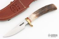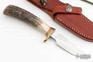 The GTR Special by Randall Made Knives is a non-catalog model, suitable for small hunting and fishing needs. This knife has a stainless steel blade with .170" blade stock, .843" blade depth, hidden tang construction. The handle has a brass guard, red/brass spacers, and a stag grip. Comes with brown leather sheath and a Randall zippered case. Excellent condition.