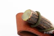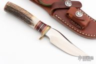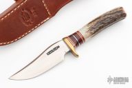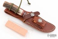 The miniature Model 27 debuted in Randall's 2012 75th anniversary catalog and is the first catalog miniature model. This knife has a satin finished stainless steel blade, .175" blade stock and .987" blade depth, hidden tang construction. The handle has a brass guard and butt plate, and a stag handle with red, brass, white, red linen micarta, black and duralumin spacers. Comes with a brown leather sheath with miniature stone and a Randall zippered case. Excellent condition.