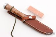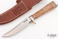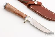 This Model 7-4 by Randall Made Knives features a satin finished upswept blade with .153" stock and .883" blade depth, hidden tang construction. The handle has a nickel silver guard with black/duralumin spacers, duralumin butt and a maple burl wood grip. Comes with brown leather sheath and a Randall zippered case. Excellent condition.