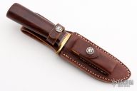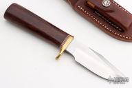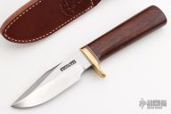This Model 23 "Gamemaster" by Randall Made Knives features a satin finished clip point blade with sharpened top edge and a notched thumbrest, .199" blade stock and 1.307" blade depth hidden tang construction. The handle has a brass guard and a Desert Ironwood grip with red/white/blue spacers. Comes with original brown leather sheath. Excellent condition.