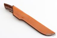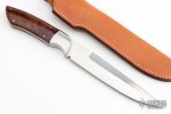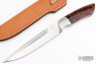 This Fighter by Ron Gaston features a double edged blade with hand rubbed satin finish, .192" blade stock and 1.255" blade depth, full tapered tang construction. The handle is comprised of dovetailed stainless steel bolsters, desert ironwood burl wood scales with stainless steel pins. Comes with brown leather sheath. Excellent condition.